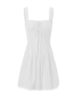 Women Summer Dress Sleeveless Square Neck Corset Tie-up Pleated Short Dress Casual Vintage Dress